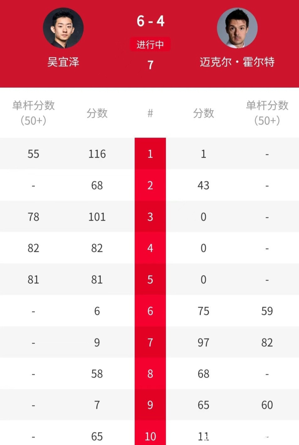 第二局,吴宜泽在胶著的比赛中,以68-43再胜一局,2-0逾越。第三局,吴宜泽又打出单杆78分,101-0零封霍尔特,比分上风扩大到3-0。